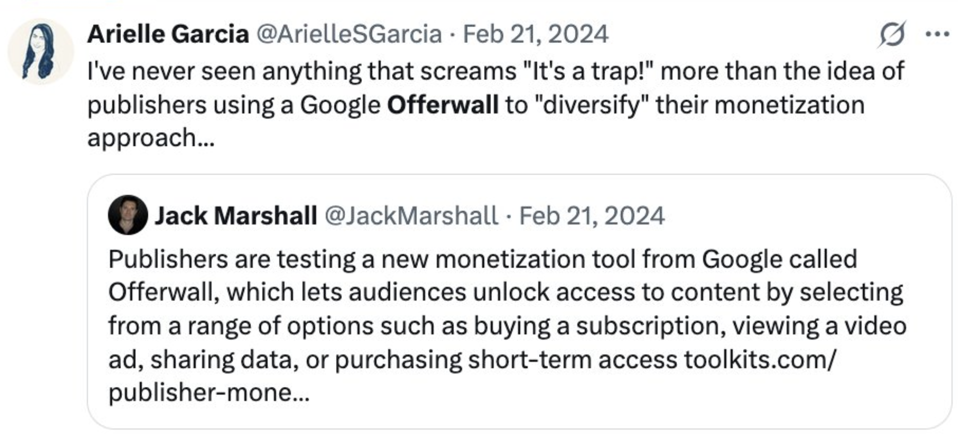 I’ve spoken before about how I think it would be nuts for publishers to use Google’s solution here versus independent versions of similar tech in the name of revenue diversification - particularly as I imagine it allows Google to further siphon value in the form of publisher audience data. Naturally, Google positions it as a benevolent example of publisher-focused innovation.